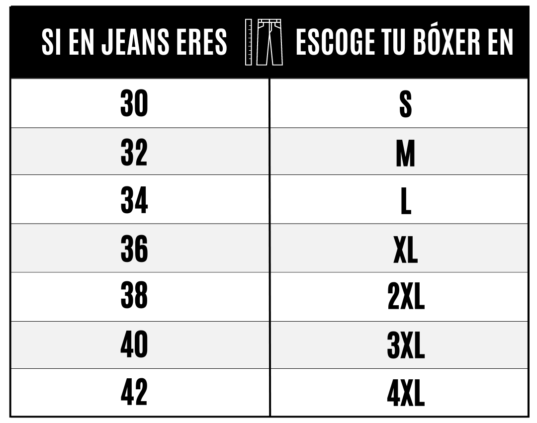 Para escoger tu talla lo haces de acuerdo a la talla que uses en jeans por ejemplo si eres 34 en jeans debes escoger el Bóxer Talla L